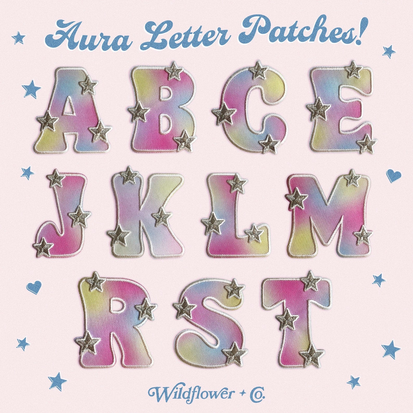 Our pastel letter patch features a dreamy aura print embroidered with metallic silver stars. It's perfect for personalizing - Choose A B C E H J K L M R T or S!