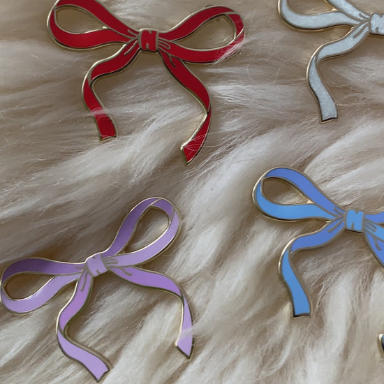 Our bow pin is the sweetest finishing detail for the coquette aesthetic! Available in pink, red, sky blue, lilac, pearlized white or pearlized ballet pink enamel.