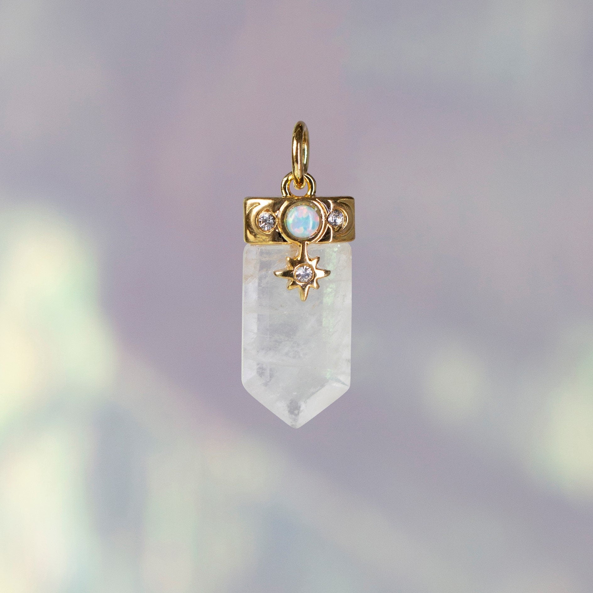 Our newest Crystal Charm - Pendant is so magical! Cap is beautifully detailed with a synthetic opal as the full moon surrounded by moon phases. Clear crystal quartz, dipped in gold. Wildflower + Co. Jewelry