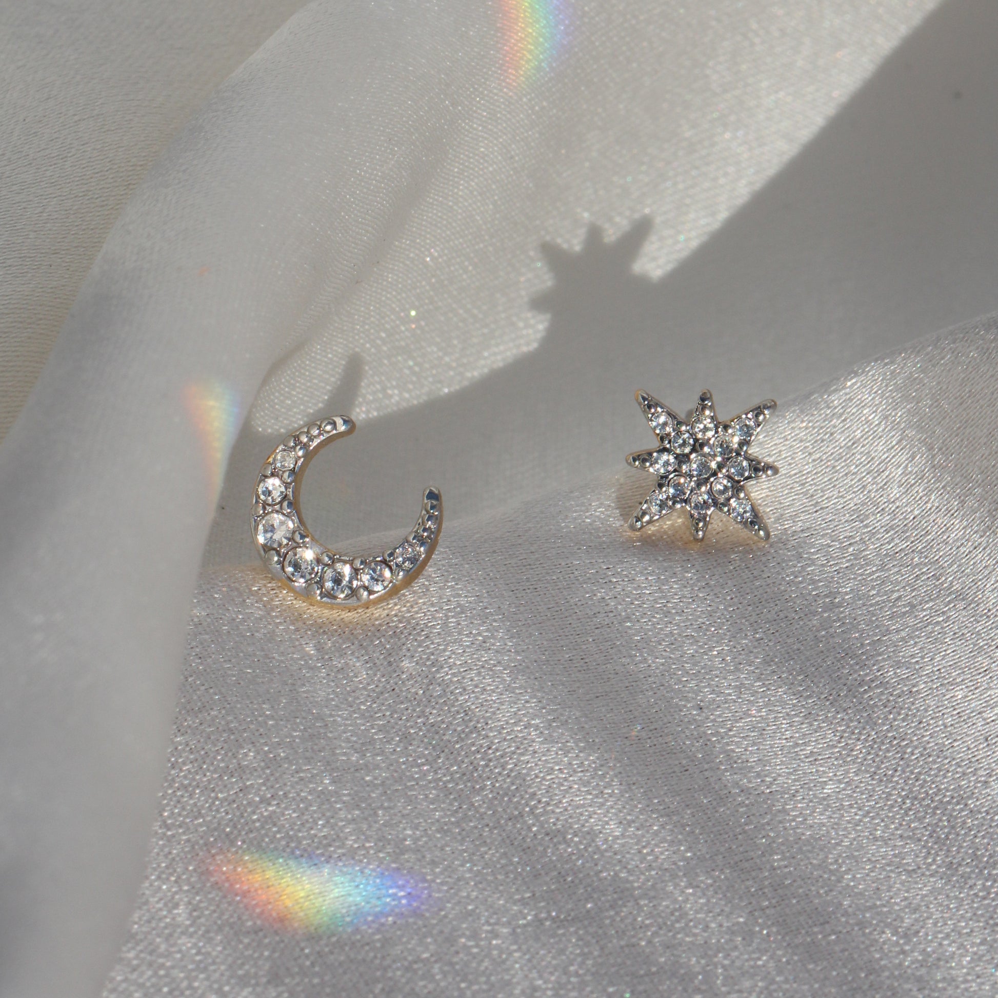 Dainty moon & north star stud earrings are pretty magical! Asymmetrical style - includes 1 crescent moon & 1 star finely detailed in pave crystals!