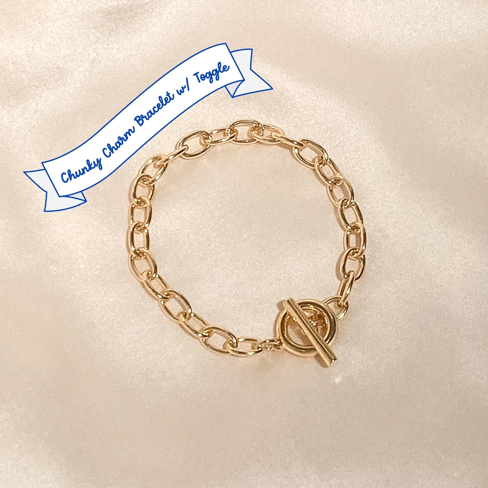 Our Chunky Charm Bracelet with Toggle Closure is part of Wildflower + Co.'s collection of Base Charm Necklaces & Bracelets, designed for use with our charms. This bracelet features a classic chain link in a polished gold finish. We recommend this for 1 to 8 charms!