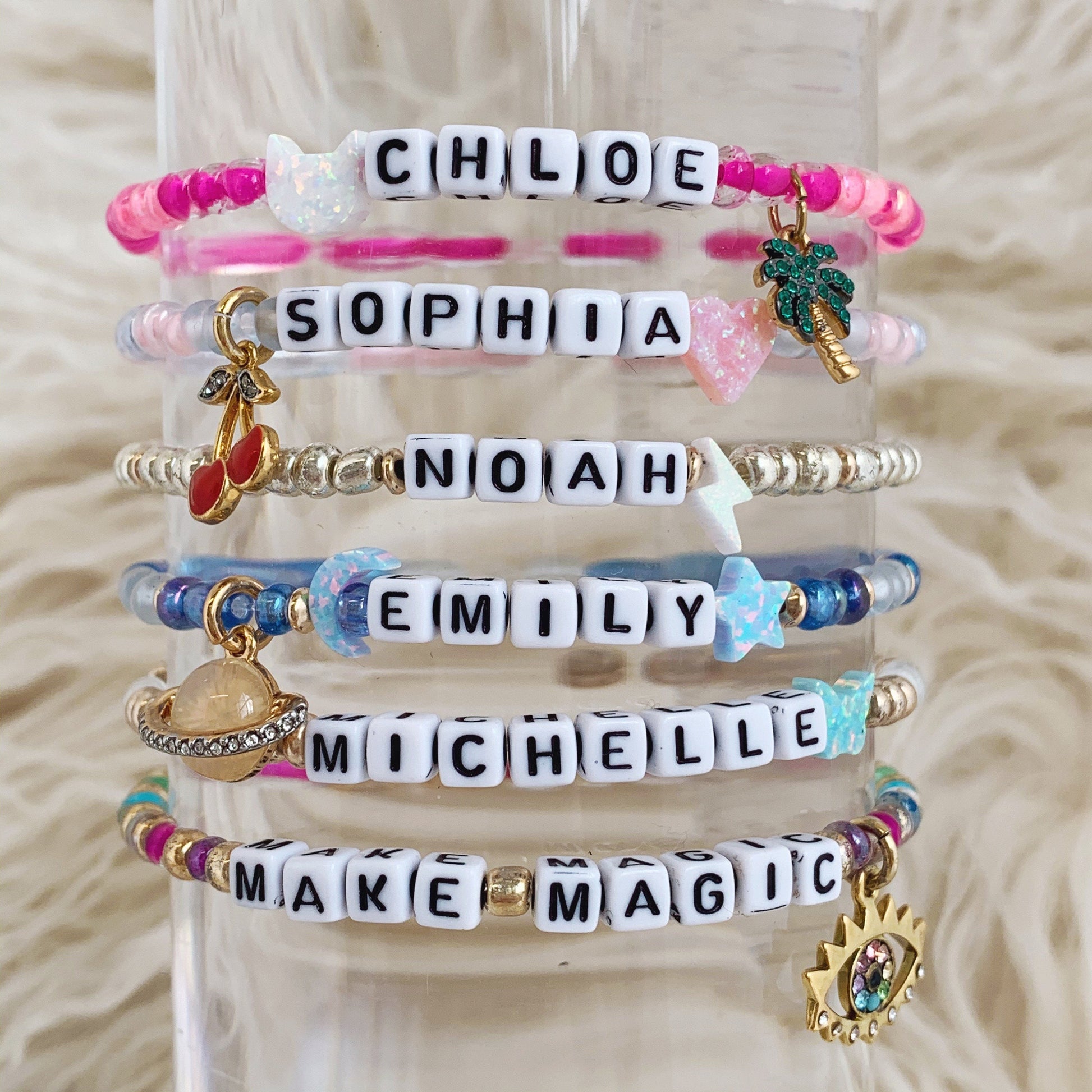 Custom name bracelet can be personalized with any name or word. Or layer a few words to really make a statement! Dream up what you want or choose from one of our faves! Packaged in our signature pink pouch - perfect for gift giving!