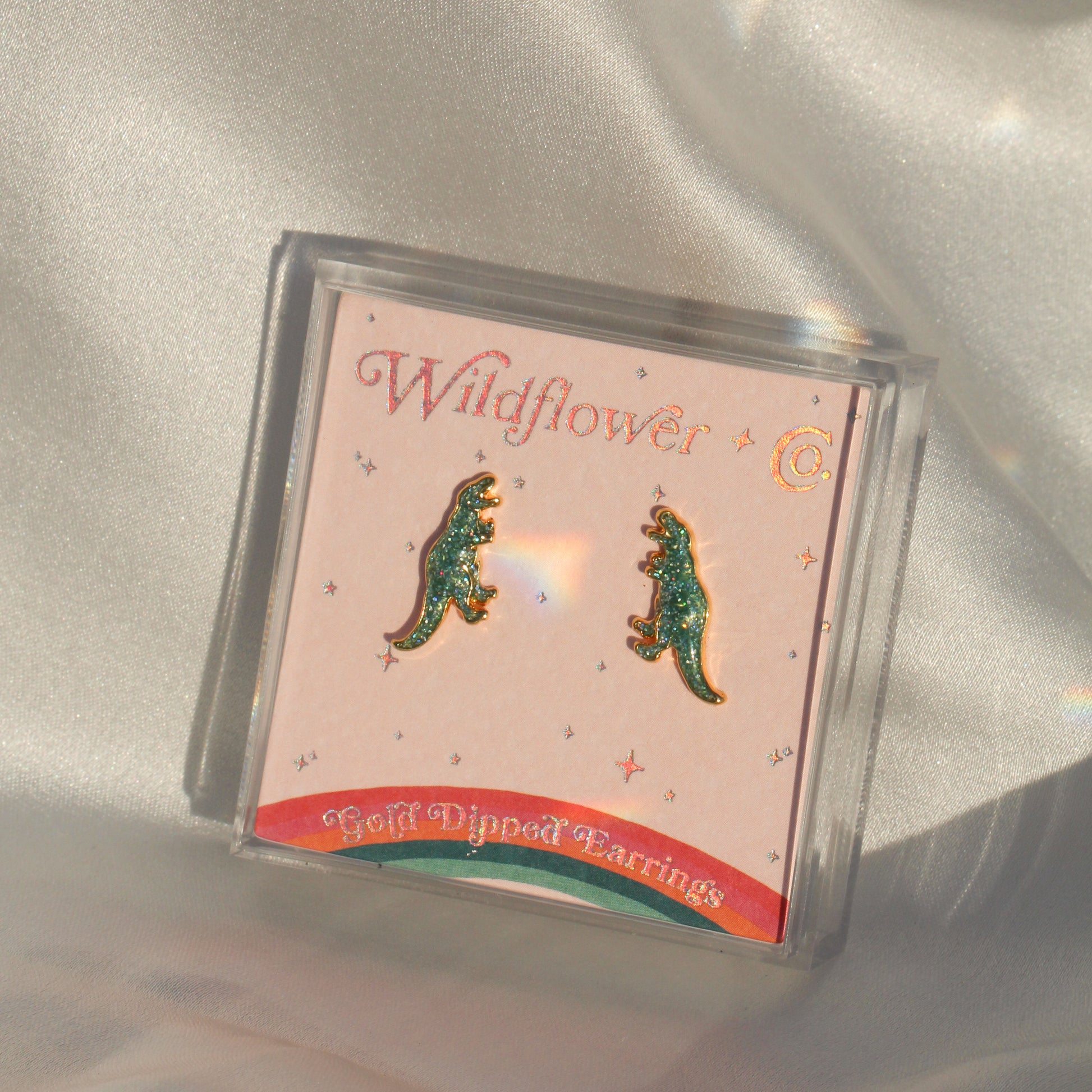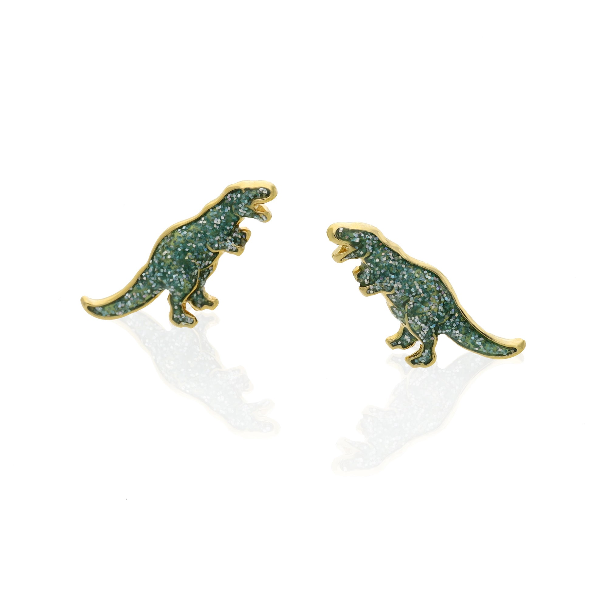 Cute t-rex dinosaur stud earrings in mint glitter enamel trimmed with gold dipped accents!