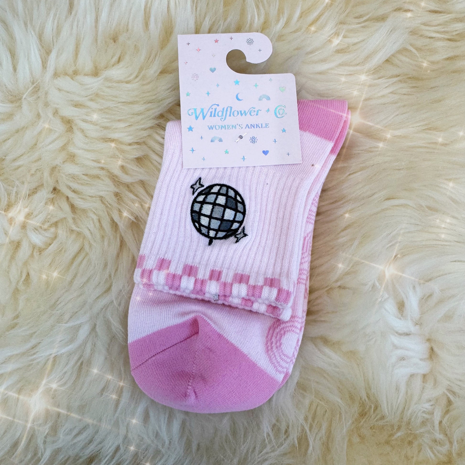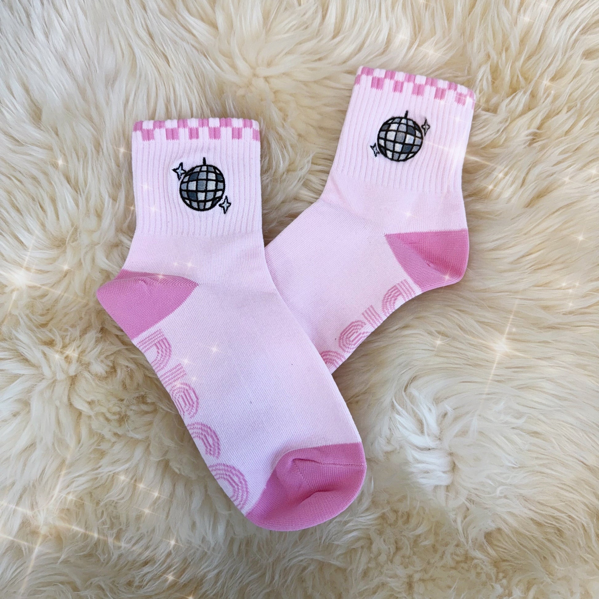 Cute & cozy, pink socks with whimsical disco ball embroidery & checkered trim!