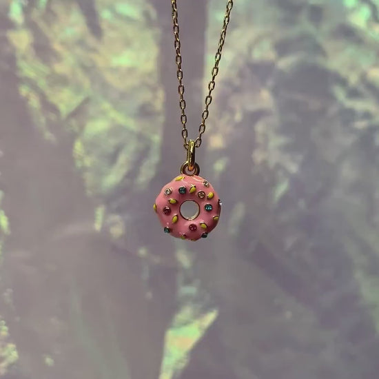 How sweet is this lil' donut necklace (or bracelet)?! Intricately detailed in pink enamel "frosting", rainbow crystal "sprinkles", & dipped in genuine gold plating.