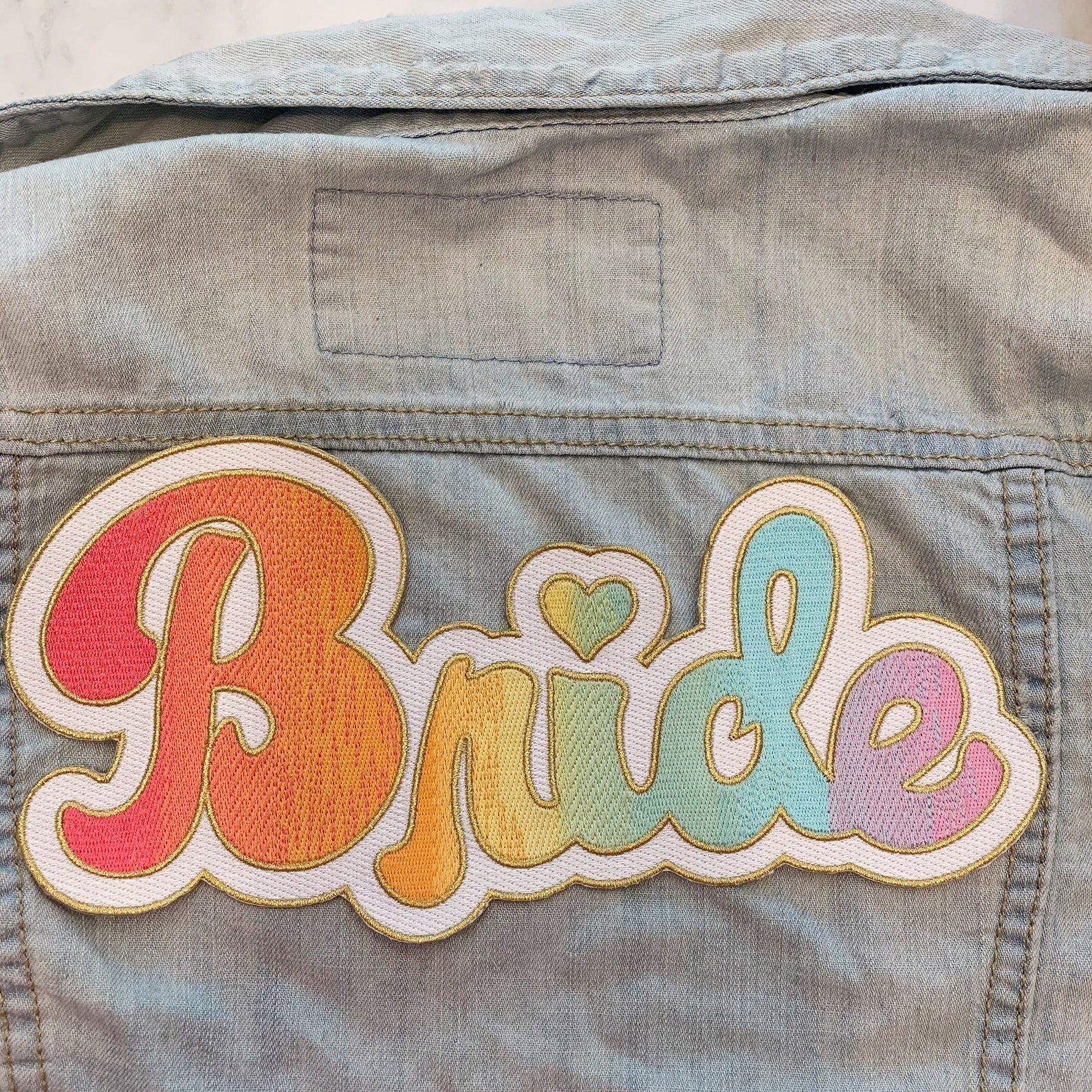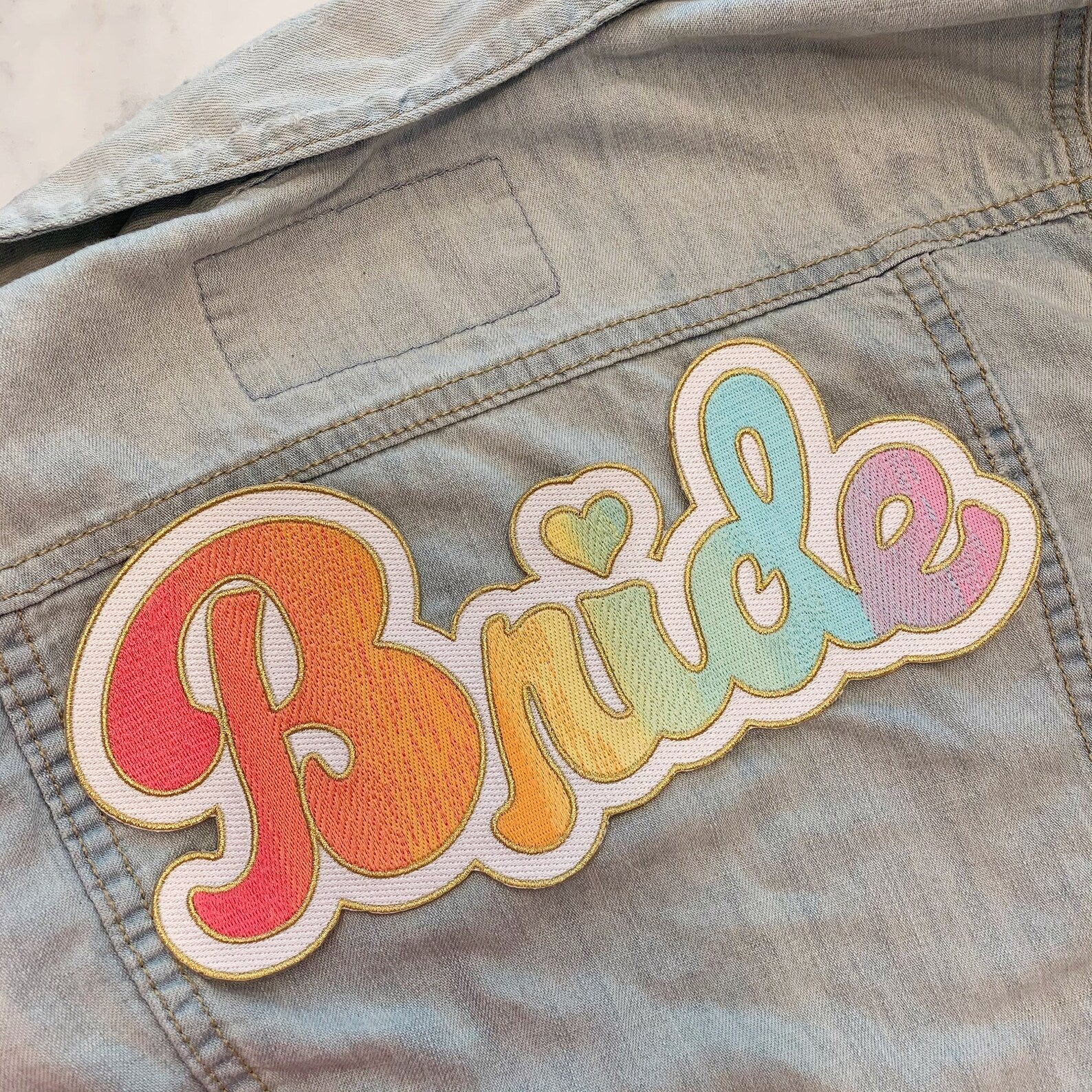 Show off your pride & LOVE with our whimsical LGBTQ / Lesbian Rainbow Bride XL Back Patch. Perfect for making your dream bachelorette, wedding or honeymoon jacket!! Dreamy rainbow gradient with a sparkly gold outline. Cute for Pride (or any bride who loves color)!