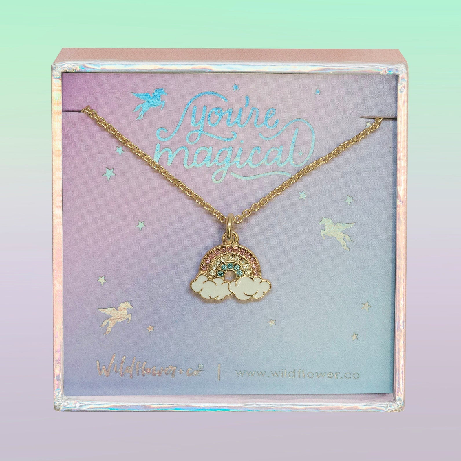 Super cute rainbow necklace or bracelet in pastel crystal pave, enamel clouds, & dipped in gold plating.