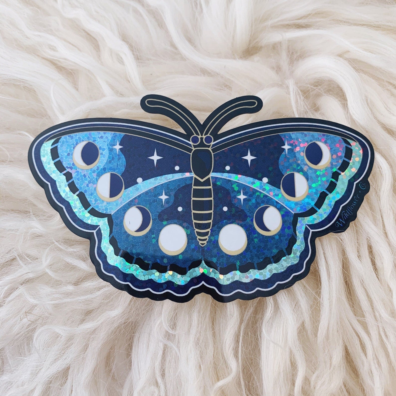 Lunar Butterfly glitter sticker captures the magic & mystery of the night sky. Gorgeous, super sparkly holographic glitter vinyl sticker. Detailed with moon phases & celestial accents.