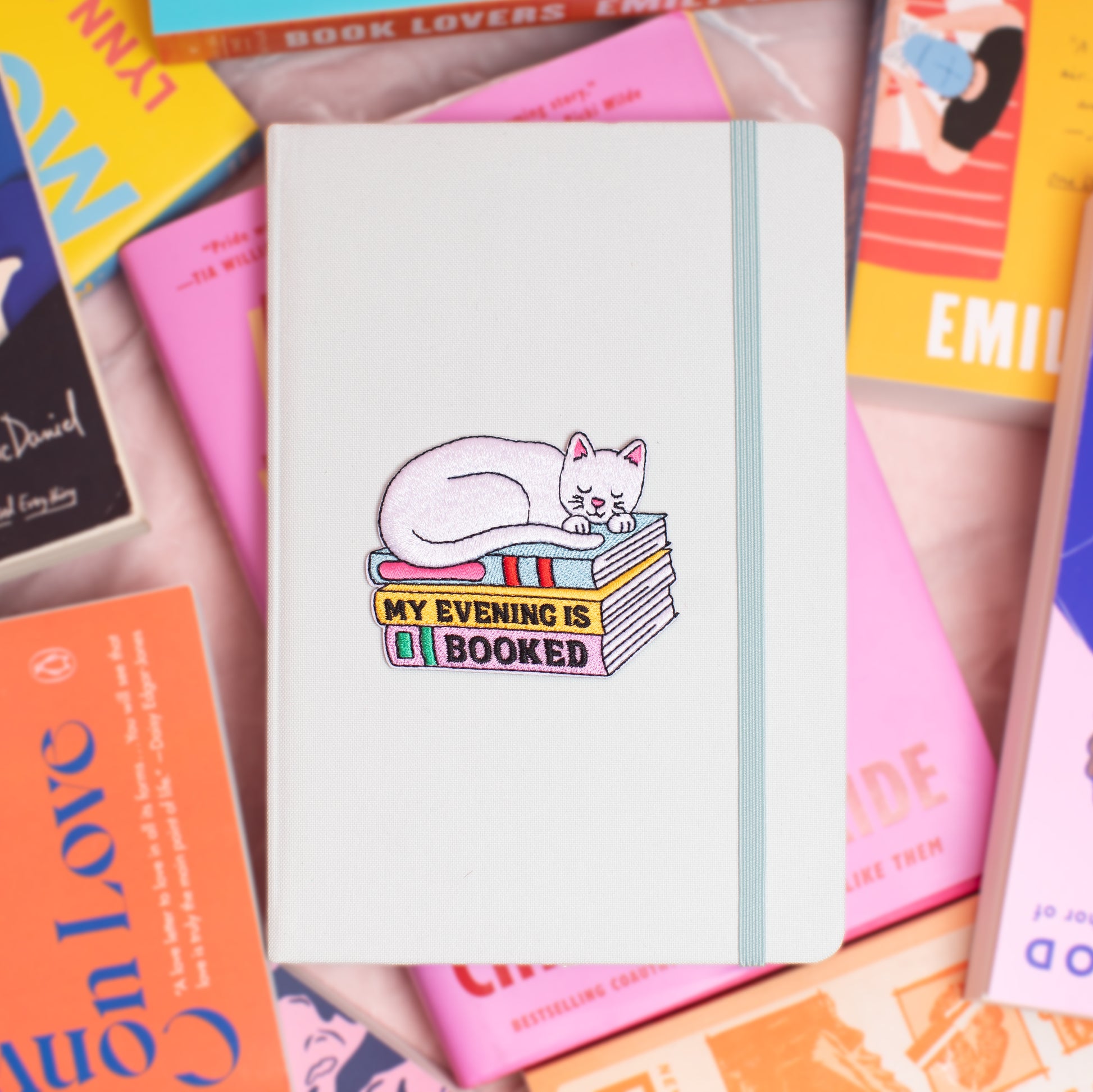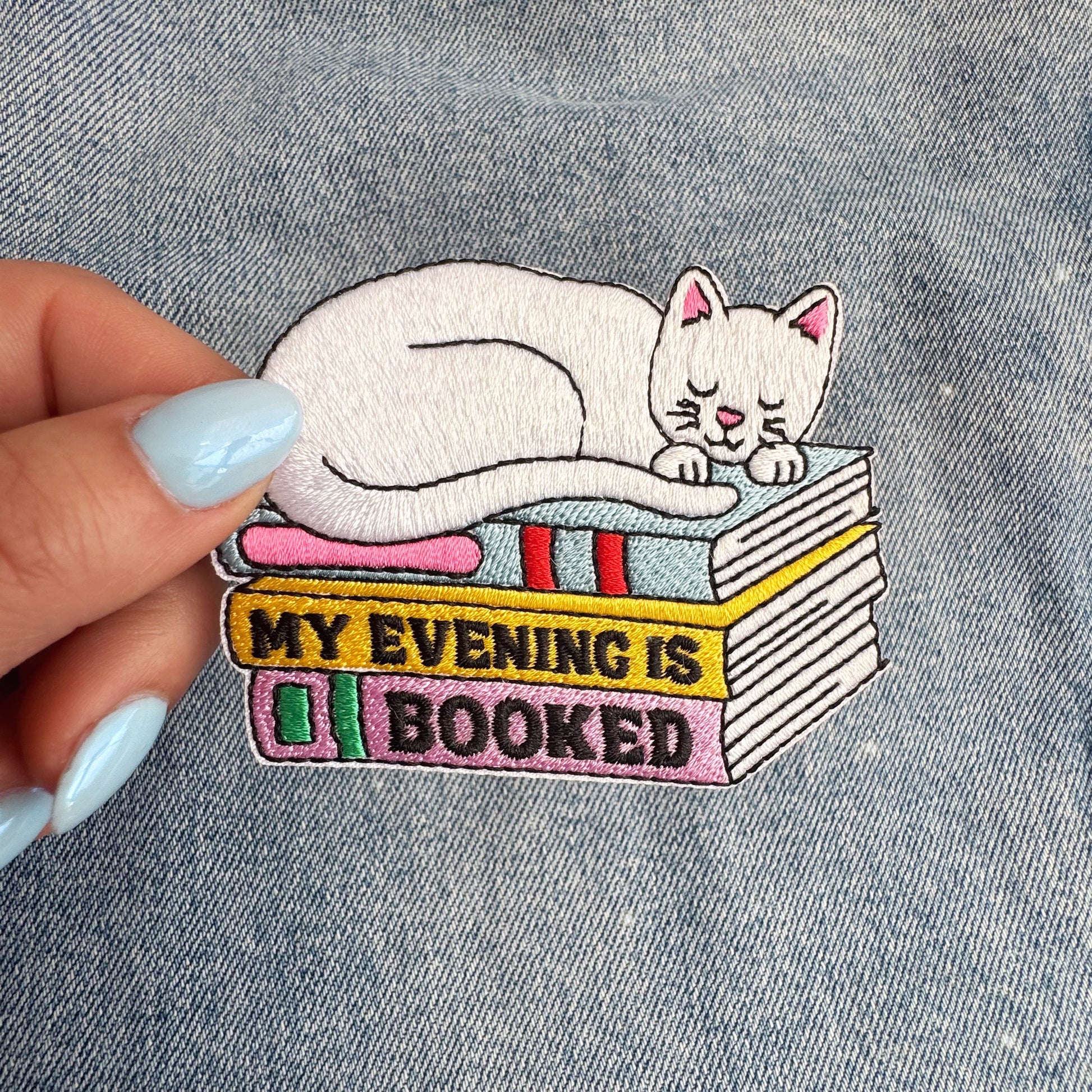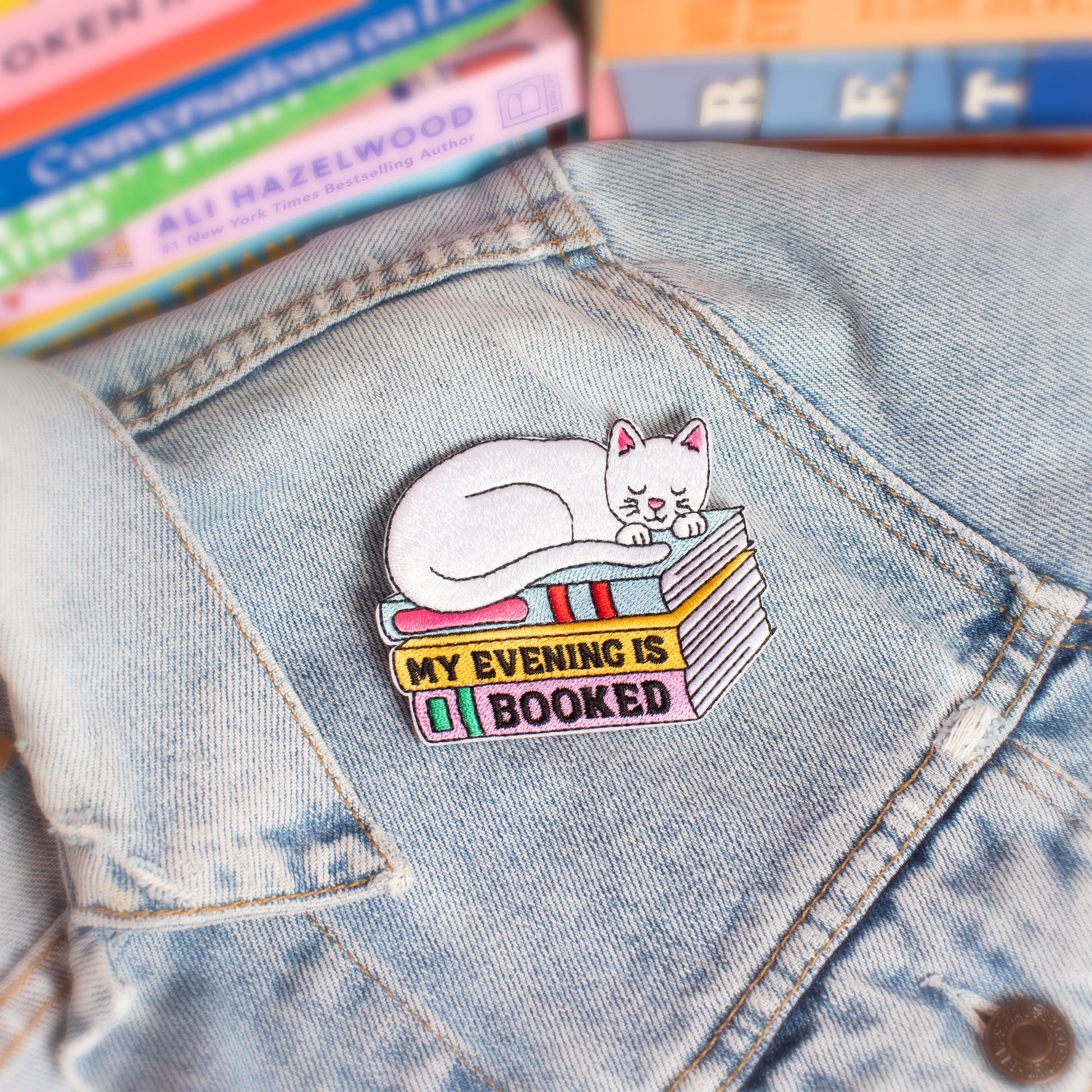 My evening is booked! This cute cat patch is an adorable gift and accessory add-on. Perfect gift for cat lovers and booktok girlies. Subtle glitter accents to highlight the important things - cat naps and book stacks !