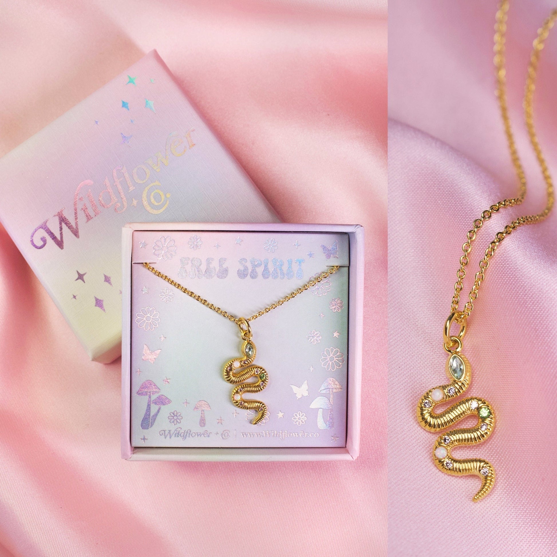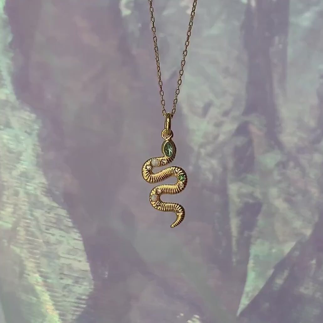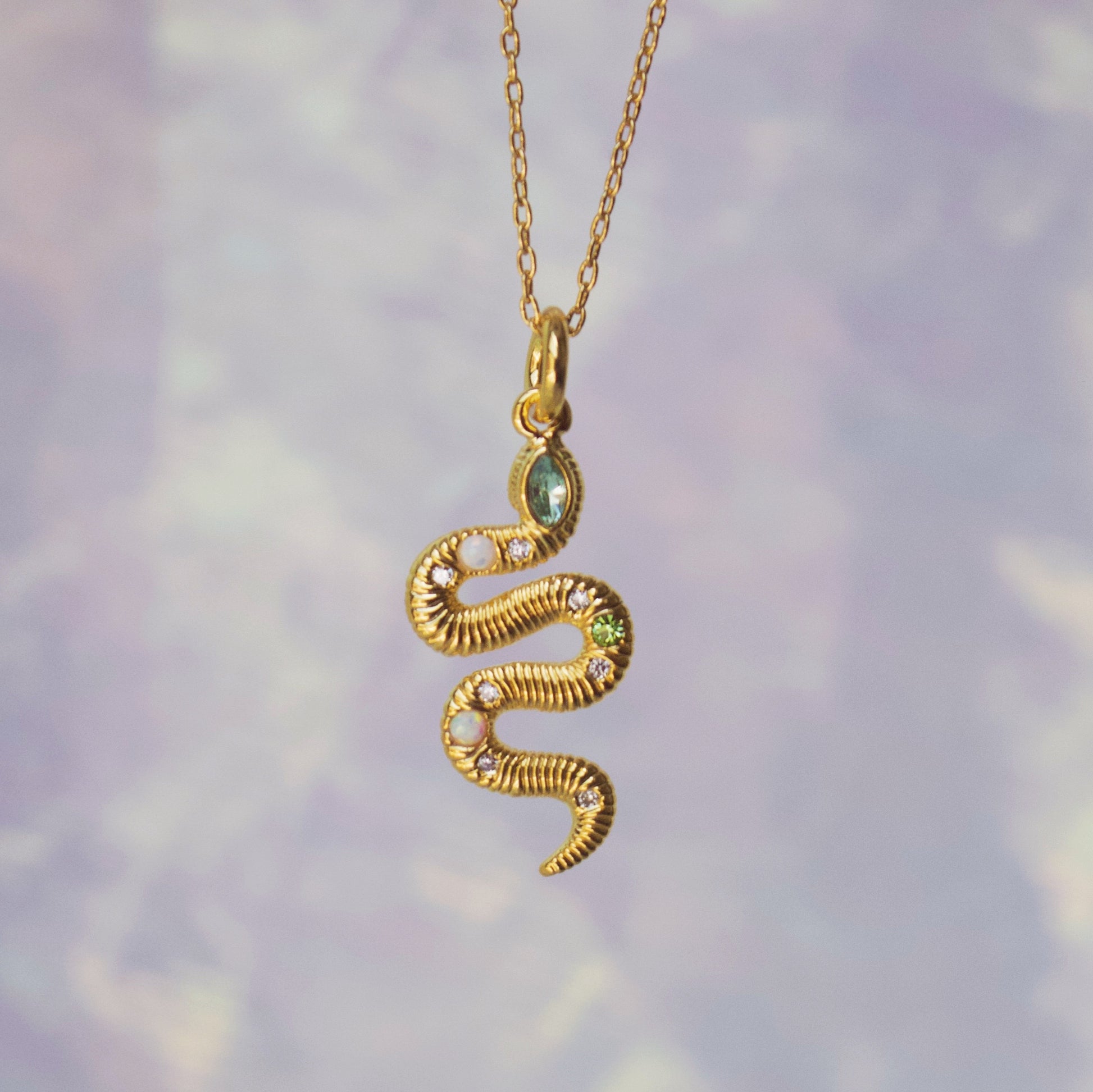 Our newest Serpent or Snake Charm Necklace - Pendant is srsly gorgeous! Body is intricately detailed with delicate synthetic opals, peridot green crystals & dipped in gold.