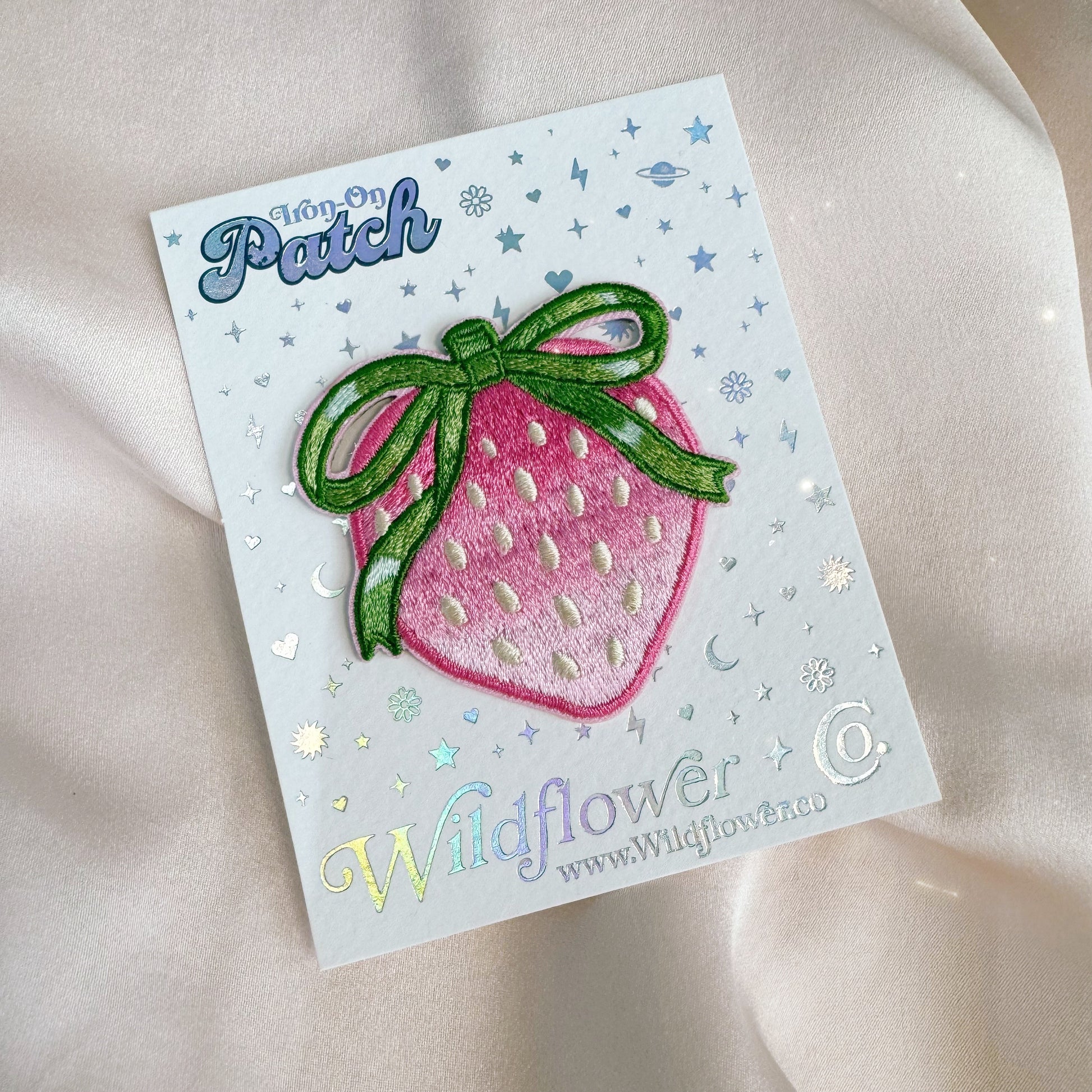 Strawberry with Bow Patch is a sweet accent for the coquette aesthetic! Fully embroidered in gradient pinks for a special touch. Wildflower + Co. DIY patches.