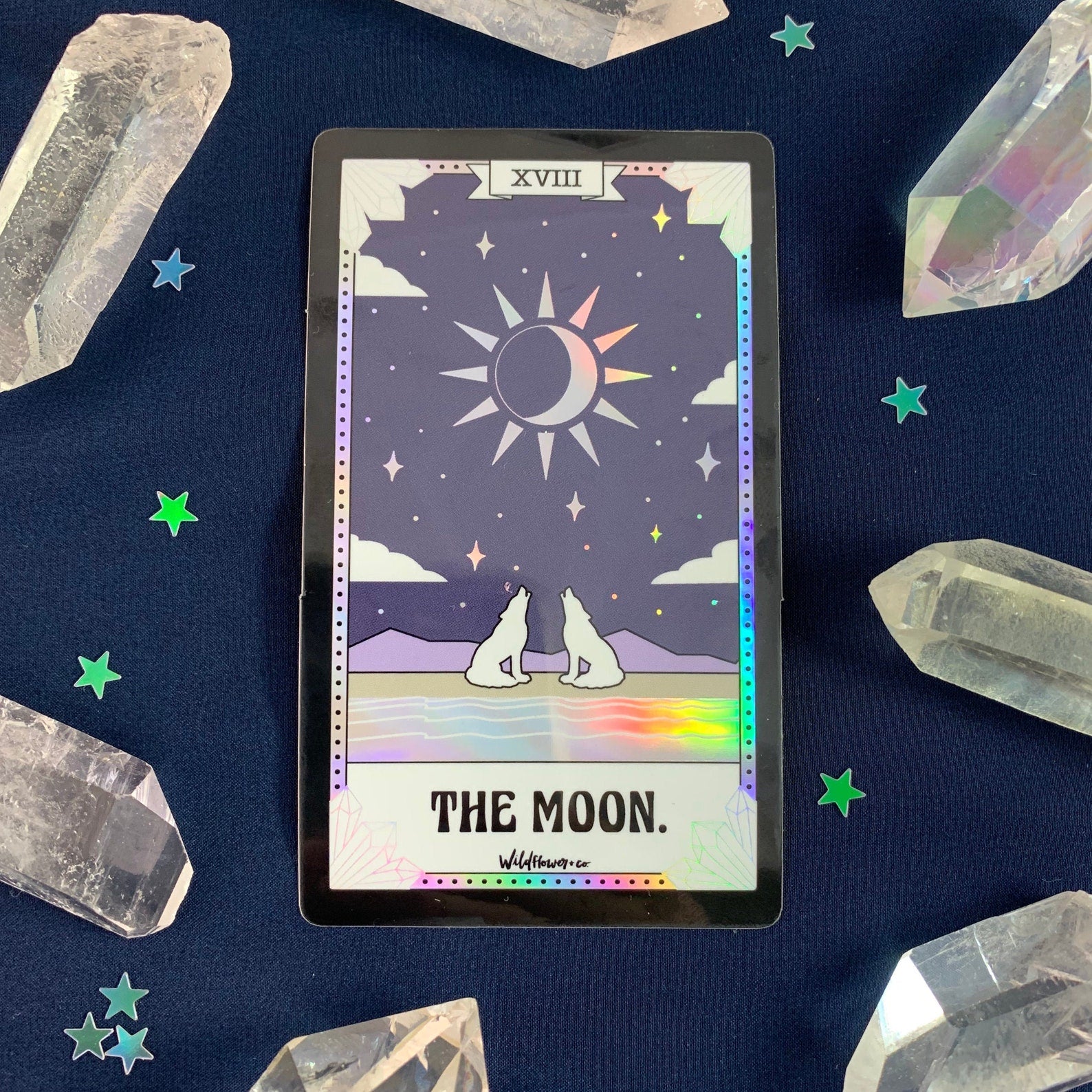 The Moon Tarot card STICKER hypnotically depicts a pair of wolves howling at the moon. Holographic vinyl for magical & mystical vibes!