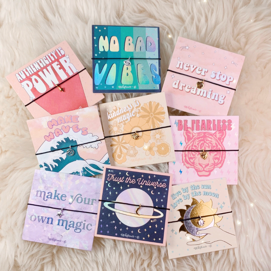 Choose your fave charm & card for the perfect gift! All charms are on black cord bracelets are adjustable & one-size-fits most. Packaged in our pink velvet pouch, these make the cutest gift!