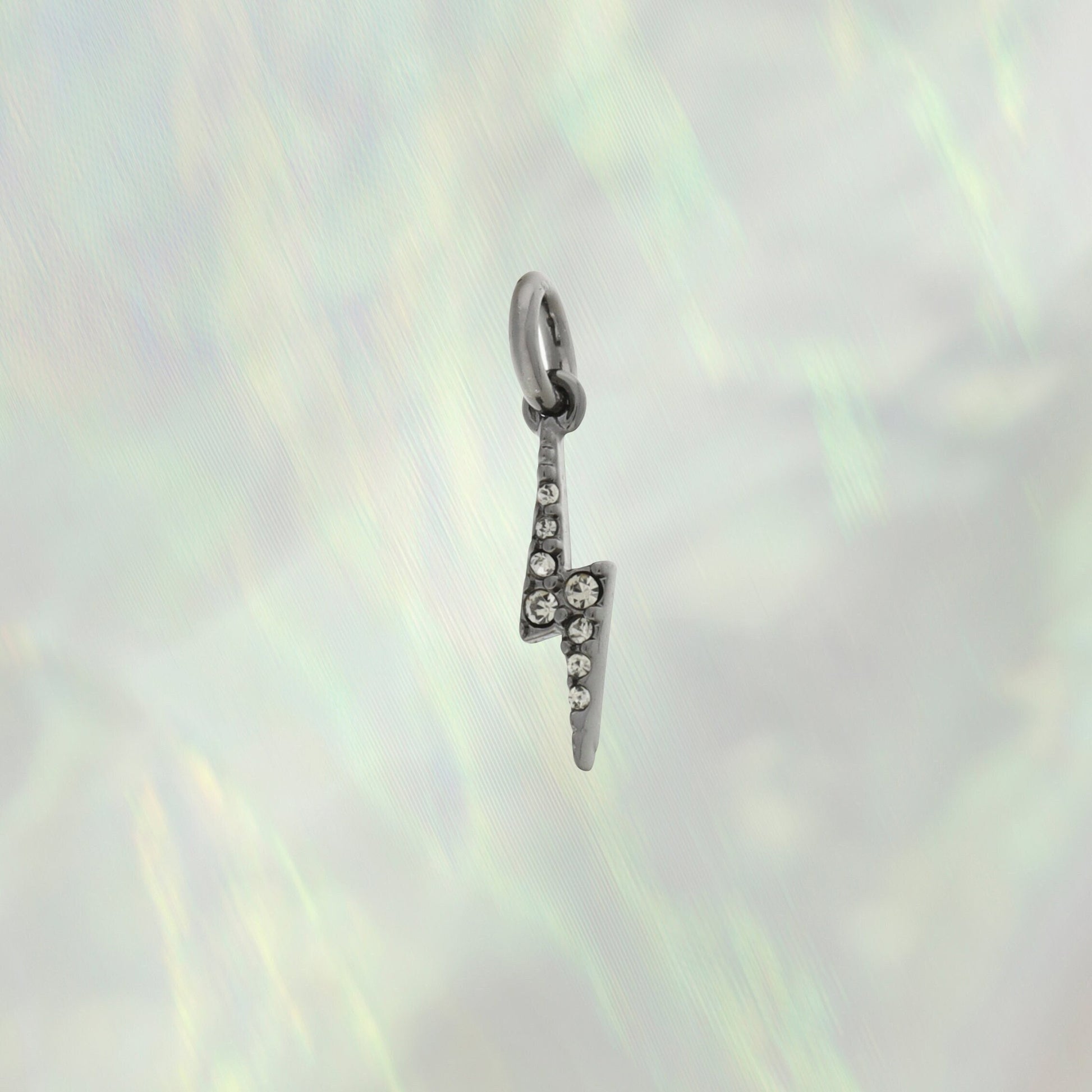 Add a little spark with our tiny pave lightning bolt charm! Black diamond (color) micro pave set in hematite plating.