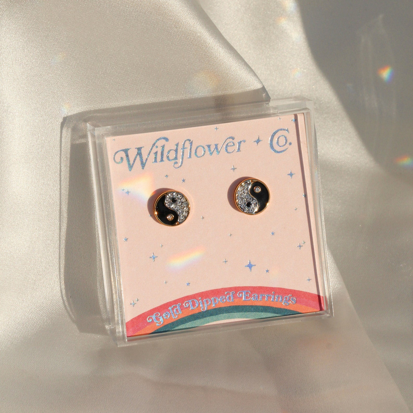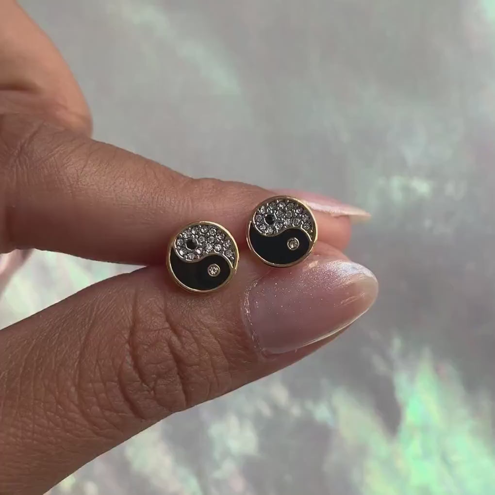Our yin yang stud earrings are perfect for the 90's / Y2K aesthetic! Intricately detailed in crystal pave, black enamel & trimmed in gold.